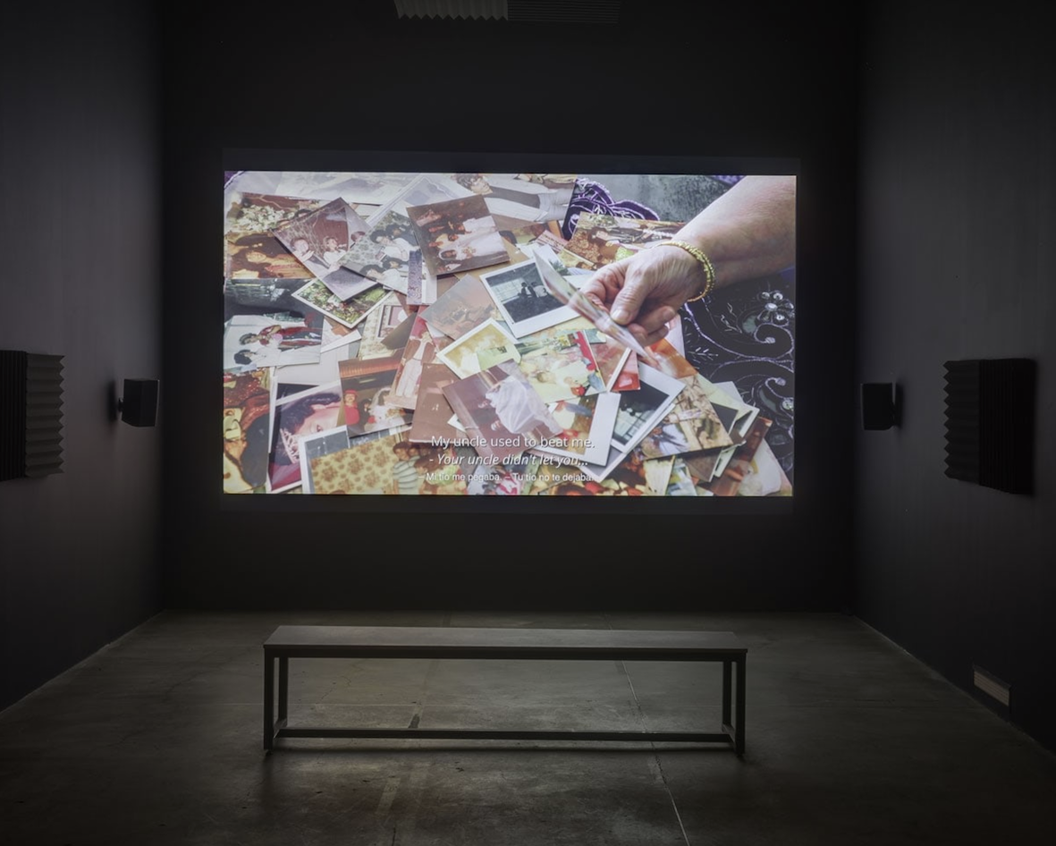 Installation: Wooden busts on metallic plinths, wooden sculptures on metallic supports, single-channel video projection, color, sound