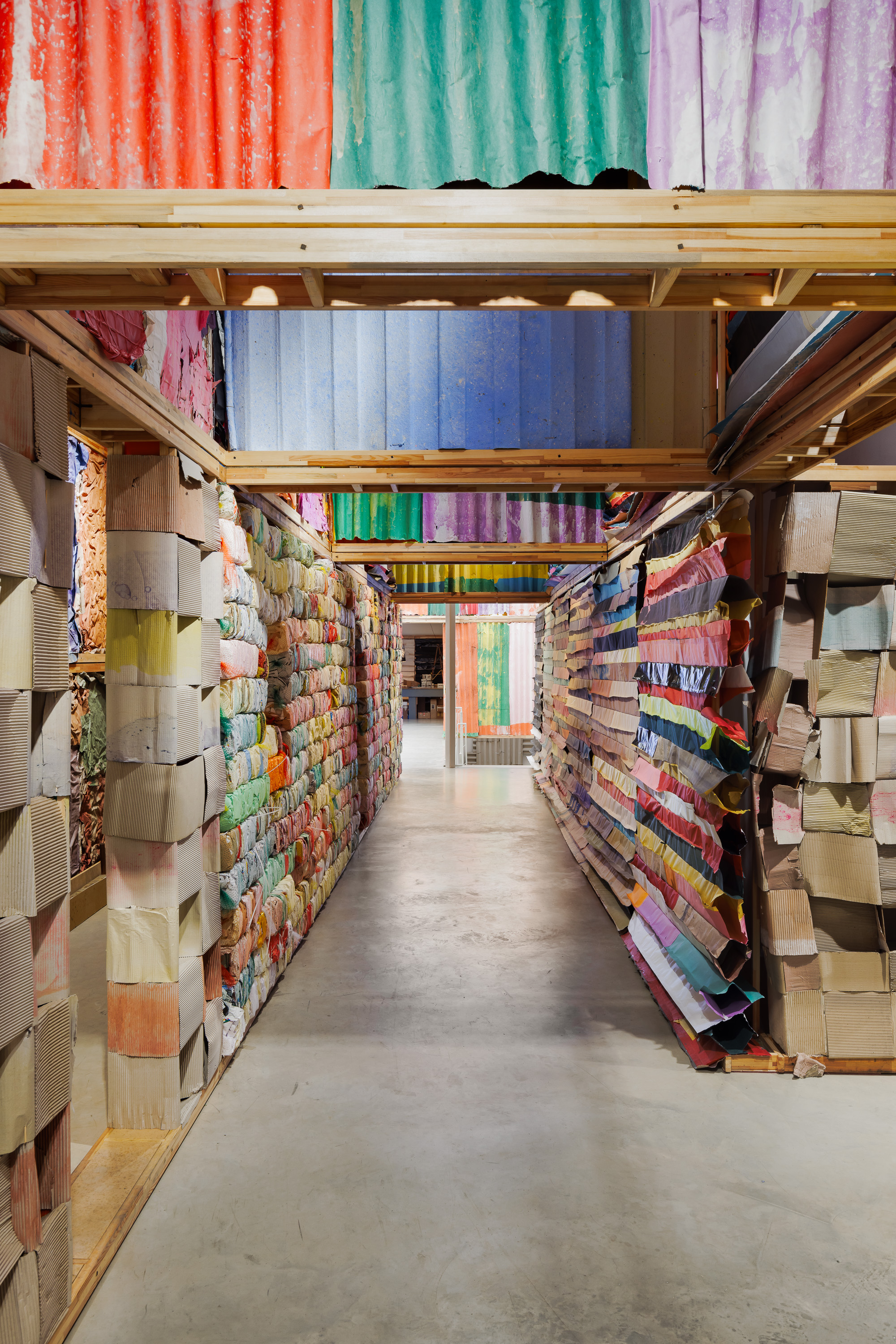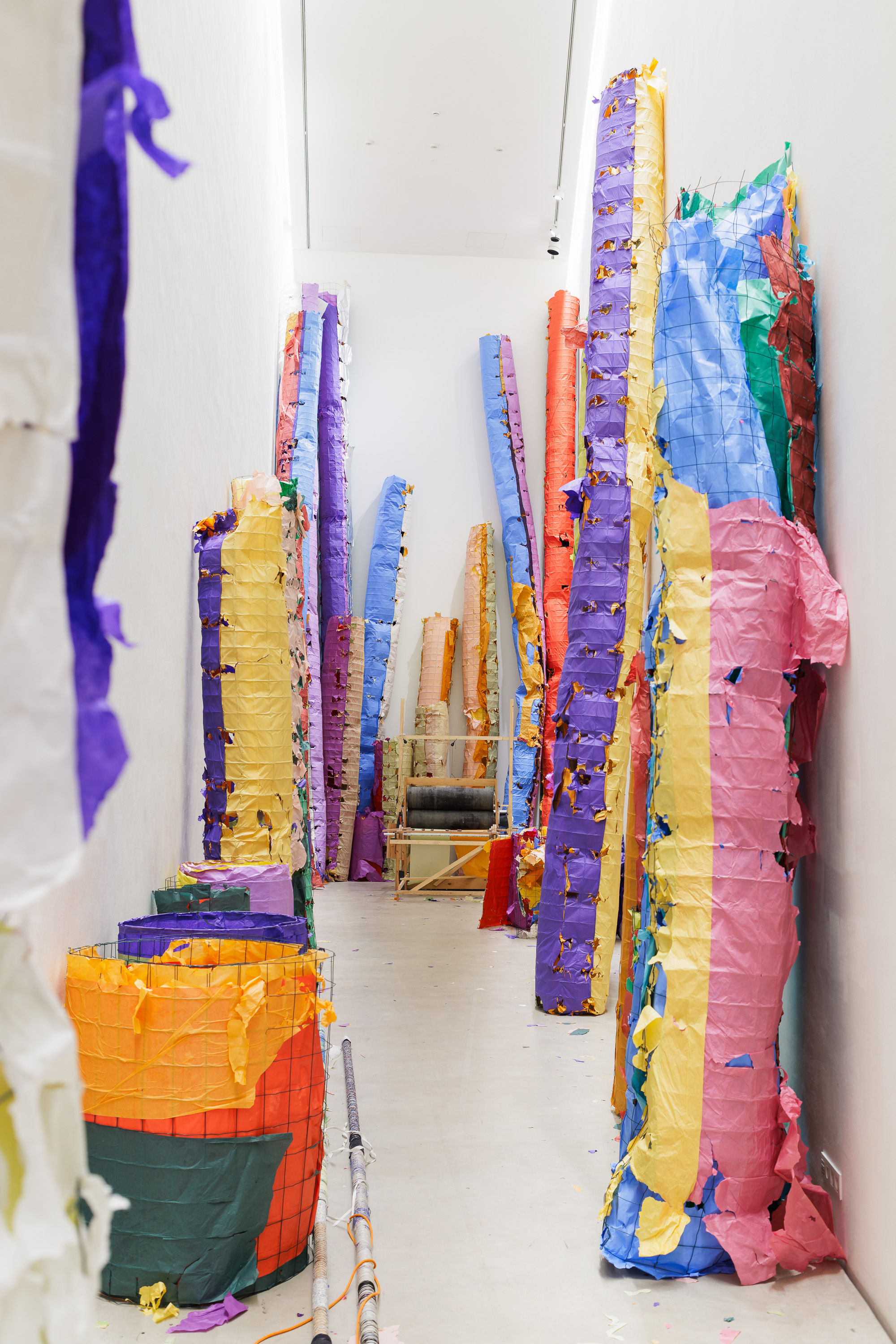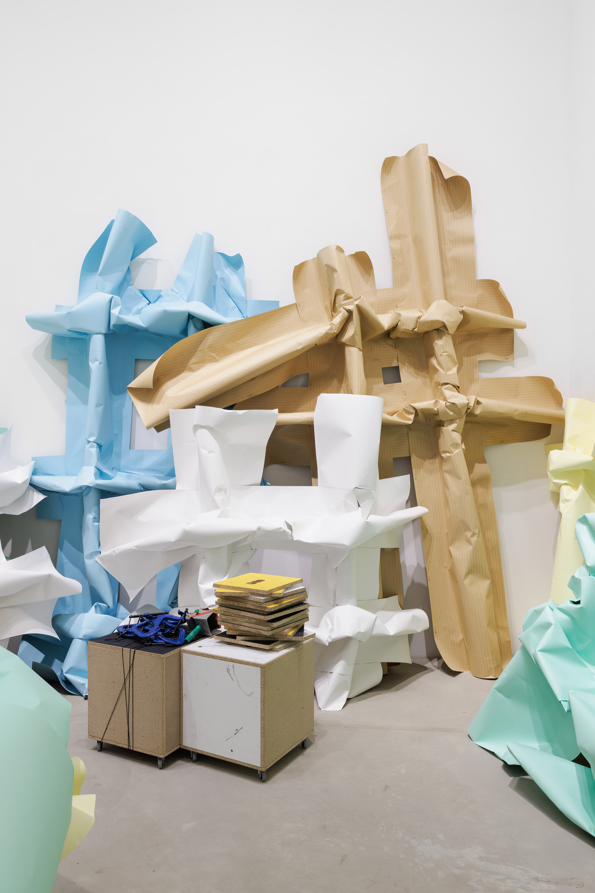 cellulose panels, crepe paper, wood, screws