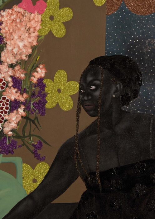 Zandile Tshabalala (1999, Gauteng, South Africa) lives and works in Johannesburg. She is the star and female voice of a young South African urban generation of Black artists. Her characters –Black women, including herself– defy racist and sexist stereotypes that have been constructed to pigeonhole Black female identity into narrow boxes. They do not conform to one-dimensional, superficial, or disparaging role attributions. Thus, they assert themselves against the representation of Black women within Western-influenced art history. In her book “Art on my mind. Visual Politics” (1995), American cultural critic, writer, artist, and feminist theorist Bell Hooks addresses the revolutionary power that the art of Black artists can have on the Black community in North America. She states: “Creating counter-hegemonic images of blackness that resist the stereotypes and challenge the artistic imagination is not a simple task.“ Tshabalala’s paintings demonstrate how this task can be achieved in the most powerful and cheerful way. Through her art, Tshabalala seeks to change the common narrative by immortalizing these women on canvas with idiosyncratic brushstrokes: “For so long we have been seen only as stereotypes, but we are so many things: sometimes we stand alone, sometimes we are in a group, sometimes sad, sometimes happy. And before we can address broader issues, we have to be properly perceived.“ (Zandile Tshabalala)