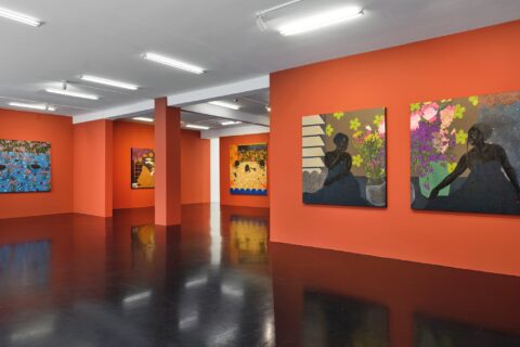 With “Don’t let me fall” Zandile Tshabalala transports us into her cinematic universe of richly detailed scenes imbued with thriving yet fragile joy. Like visual poems, her paintings speak of life moments, flashes of emotional experience to be found in the warm gathering of friends, a mother’s love, the welcoming of a first child, but equally the drowning feelings brought on by mental ill-health. The title of her exhibition is taken from a song in Cleo Sol’s album “Mother” (2021). Lying on a sofa with her baby, Sol sings “Hold me close, please don’t let me go, don’t let me fall…”, a phrase with multiple meanings that echoes the newborn’s murmurs and the mother’s inherent fear of losing or misguiding this precious life, both conditions echoed in Tshabalala’s own experience of motherhood.