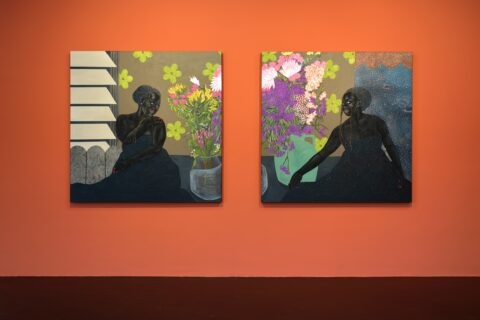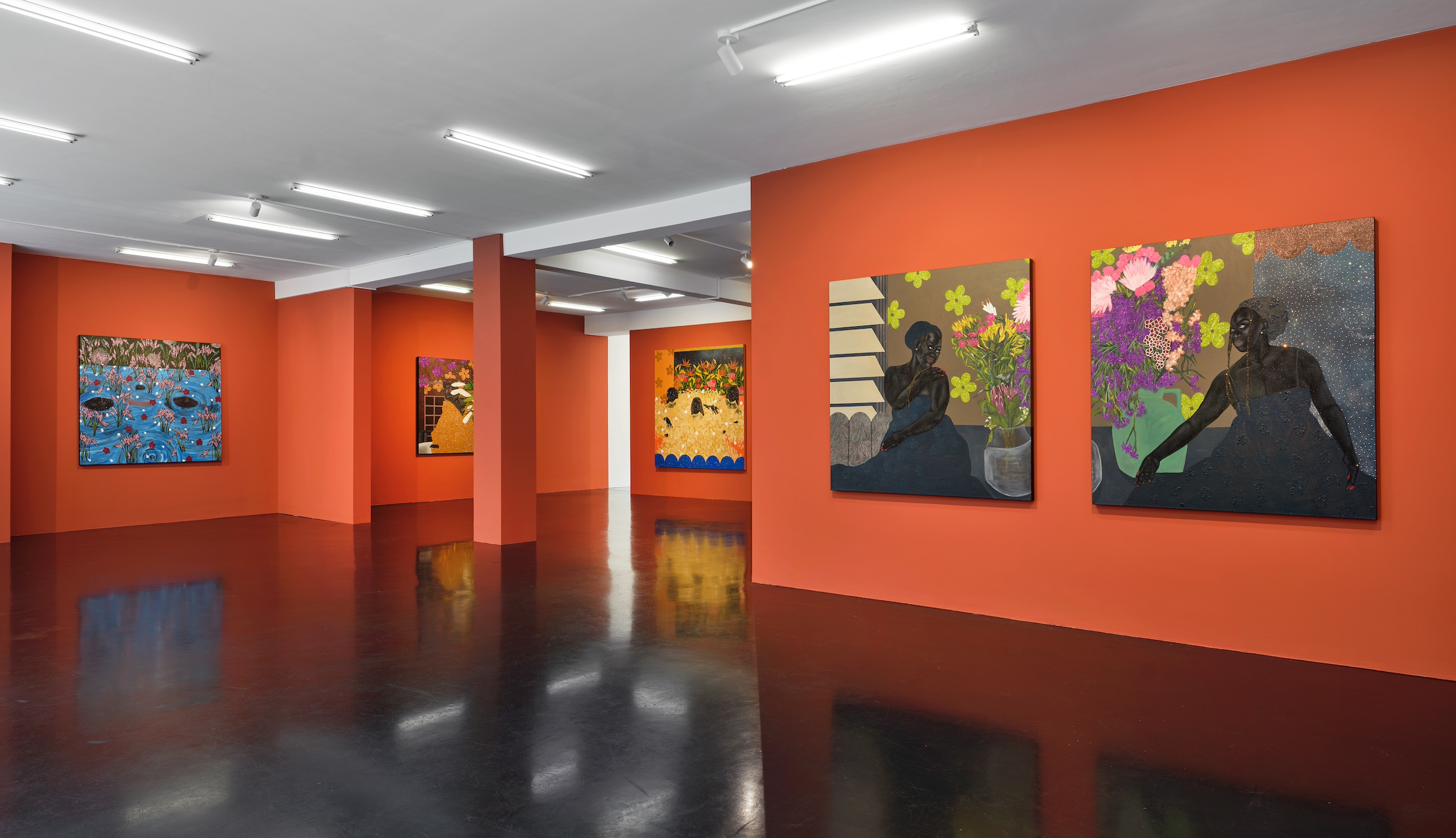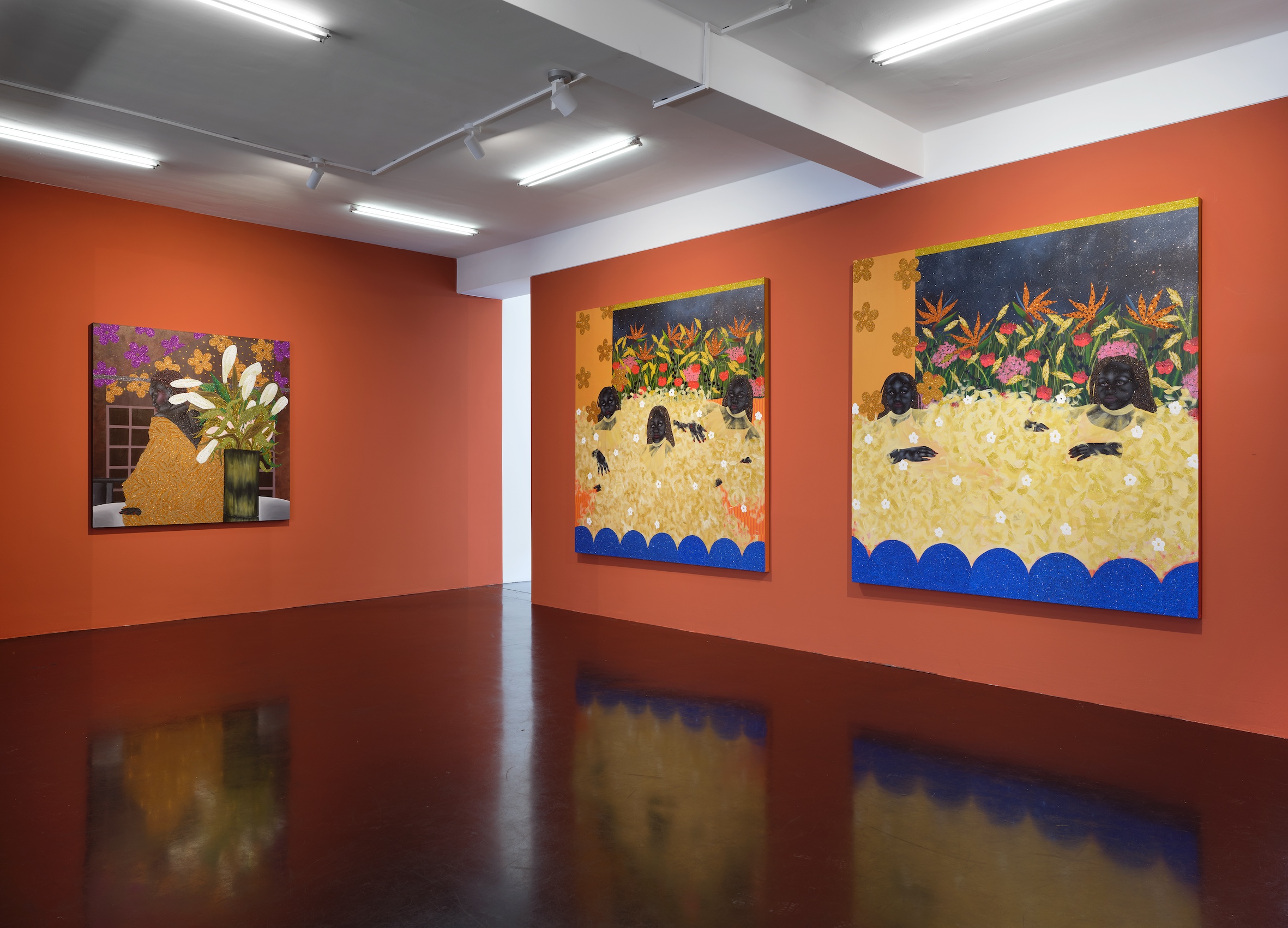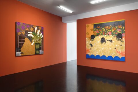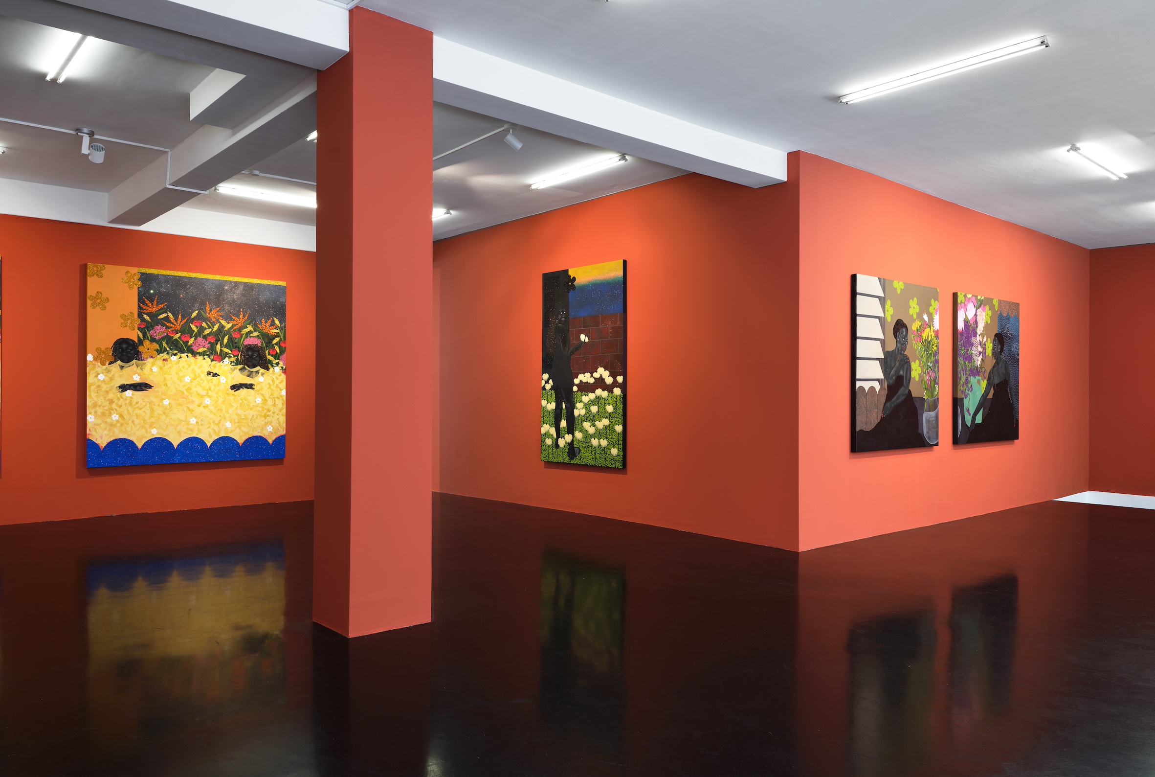 Born in Soweto in 1999 to a family of powerful and creative women, ingenious makers and movers of everyday life, Tshabalala is the first in her clan to have become a professional artist. Her trajectory has been remarkable. Beginning with her first solo show at Galerie Nagel Draxler in 2021 (“Beautiful Experiments”), she has become the key protagonist of a new generation of painters based on the African continent and exhibiting internationally. While her meteoric rise began at the highpoint of Black realist portraiture in 2020, her paintings have evolved beyond the canon with an unmissable iconographic and painterly language of their own. Her earlier compositions with their characteristic flat planes and bold use of black, white and red pigment remain but are accentuated today with microscopic multicoloured detail. Glitter boosts the hue of flowers and shades the volume of flesh, while collaged rhinestones trigger flashes of luminosity and give depth to the canvas. Her model women, more often the artist herself, with their deep matte black skin, flash of red nails, and flamboyant costumes emanate soft sensuality and composure, vulnerable only to moments of otherworldly illusion. Tshabalala’s rich pictorial imaginary injects charisma into plants and people alike capturing the metaphysics of our contemporary condition within a decidedly Black aesthetic. Her self-portraits chart her own experience all the while celebrating those girls, sisters and mothers who choose love over despair and act in dialogue with the history of South Africa’s female icons and rebels from singers Dorothy Rathebe to Miriam Makeba, and independent artists Mmakgabo Helen Sebidi and Gladys Mgudlandlu, whom she references in her floral works.