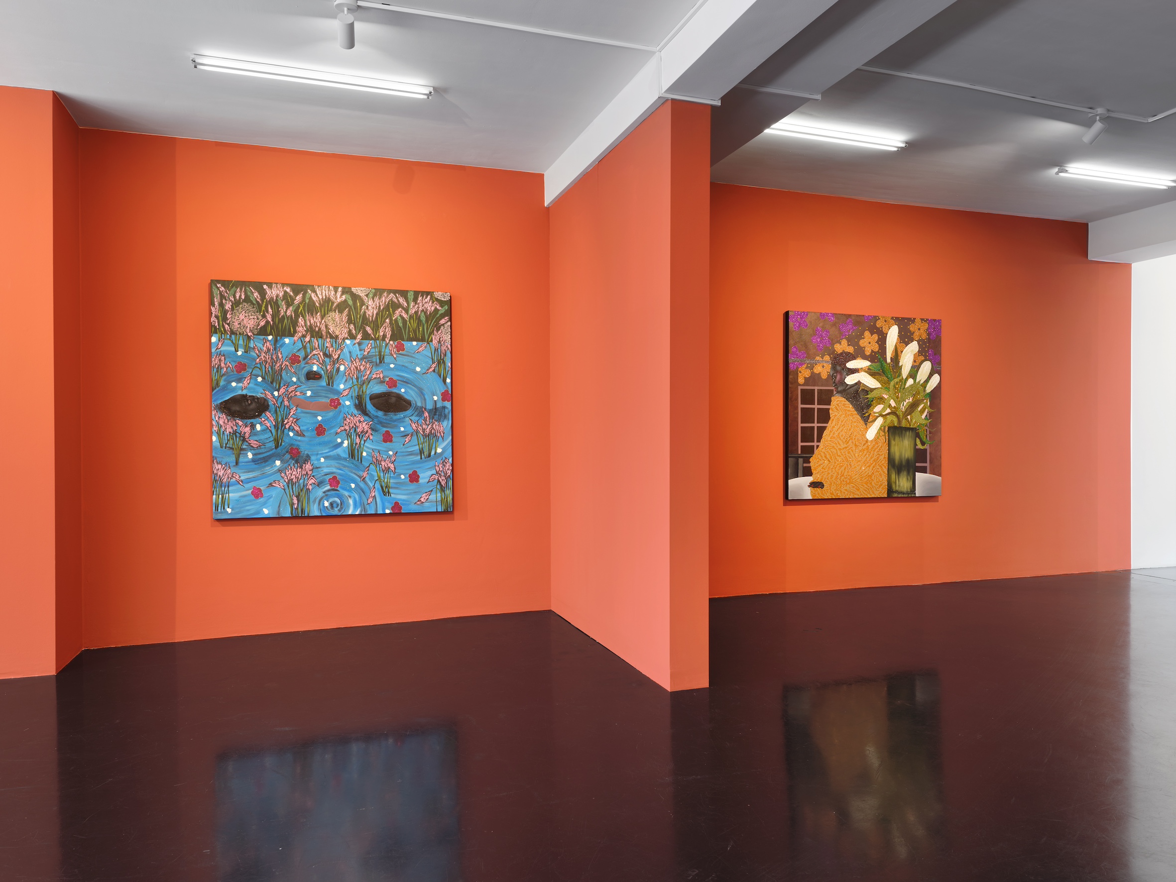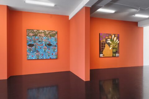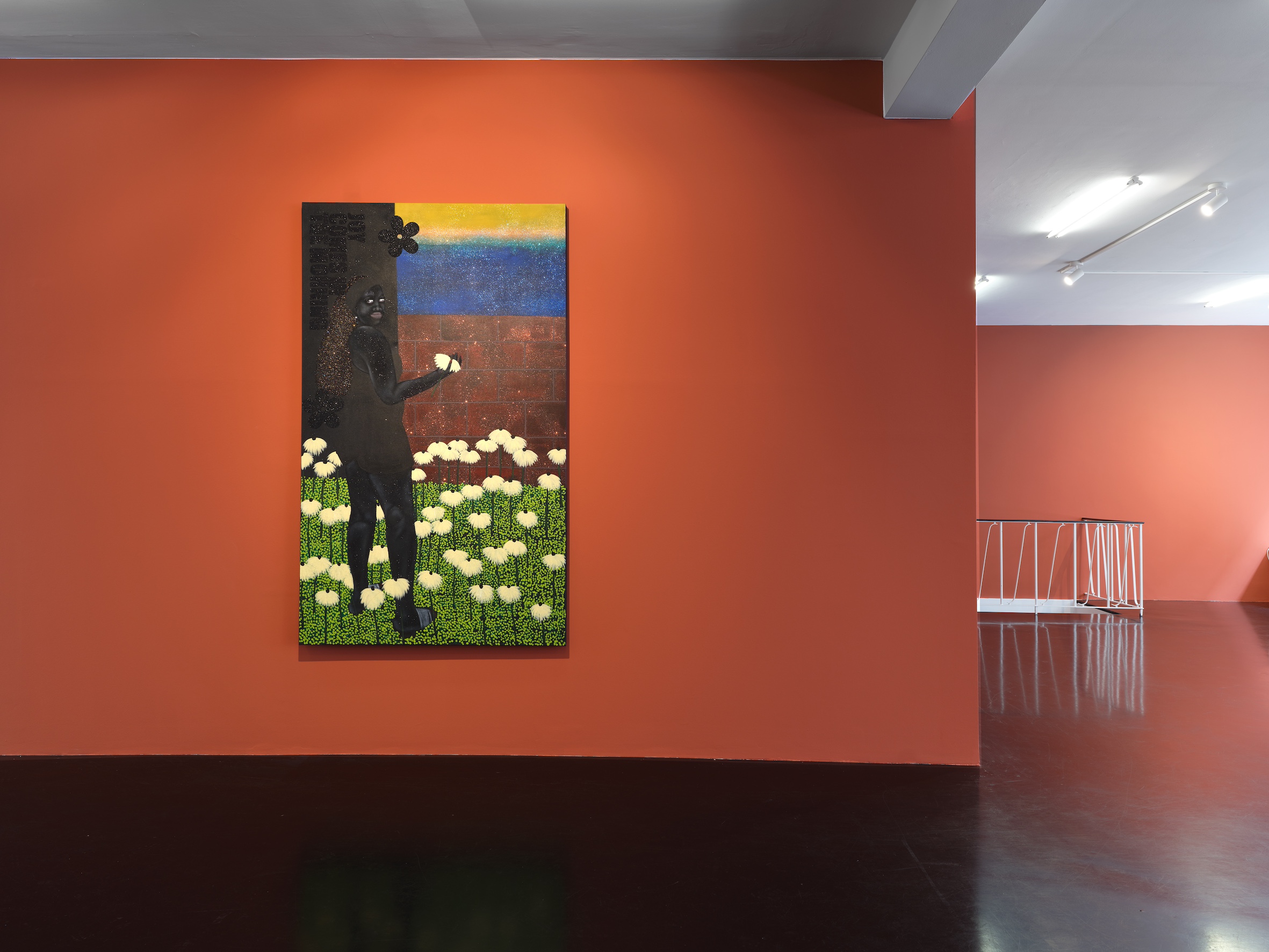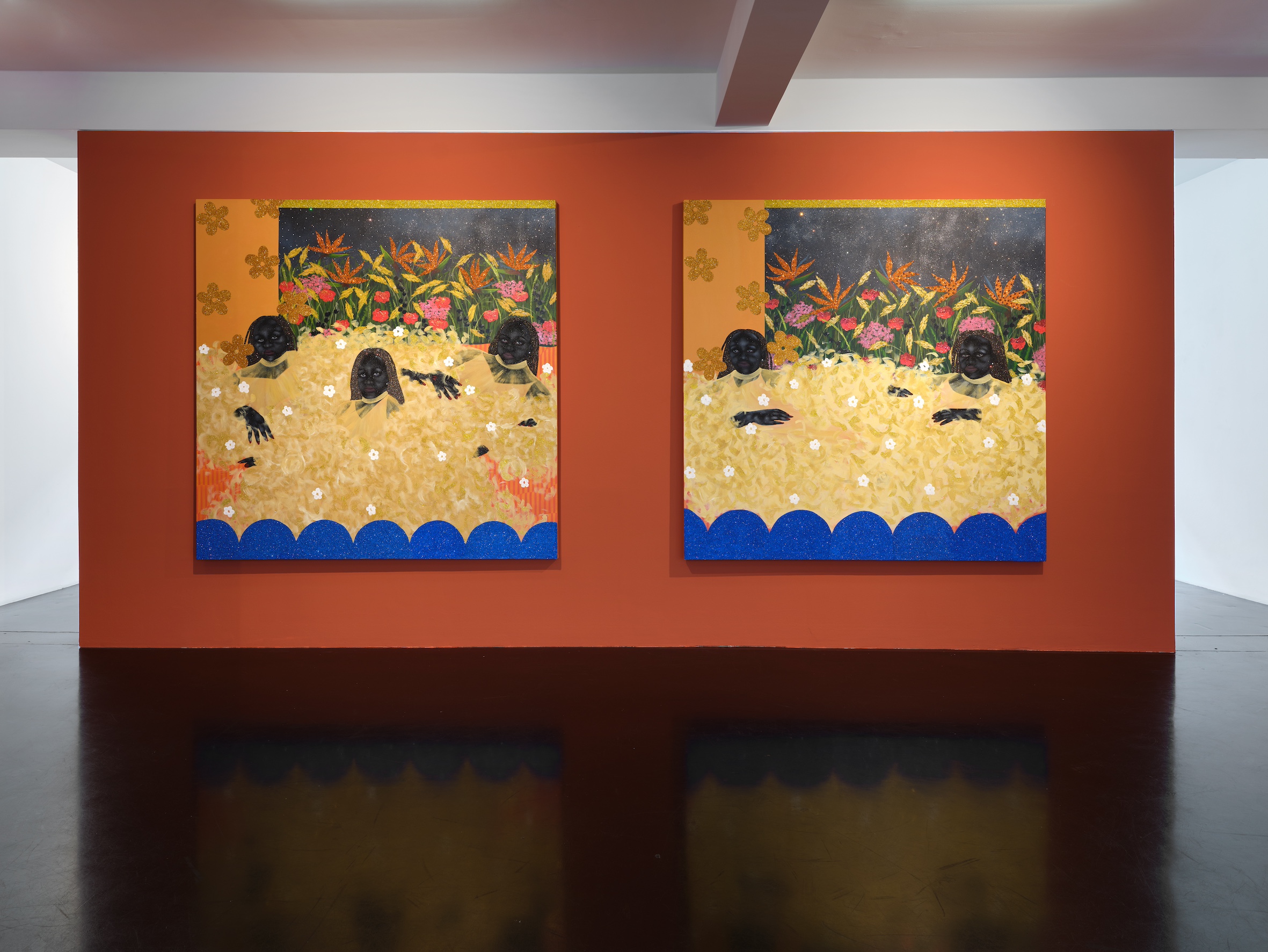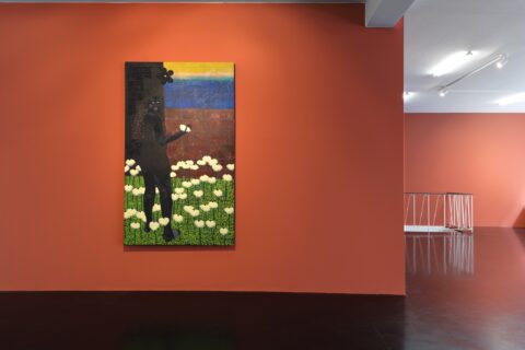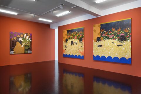Born in Soweto in 1999 to a family of powerful and creative women, ingenious makers and movers of everyday life, Tshabalala is the first in her clan to have become a professional artist. Her trajectory has been remarkable. Beginning with her first solo show at Galerie Nagel Draxler in 2021 (“Beautiful Experiments”), she has become the key protagonist of a new generation of painters based on the African continent and exhibiting internationally. While her meteoric rise began at the highpoint of Black realist portraiture in 2020, her paintings have evolved beyond the canon with an unmissable iconographic and painterly language of their own. Her earlier compositions with their characteristic flat planes and bold use of black, white and red pigment remain but are accentuated today with microscopic multicoloured detail. Glitter boosts the hue of flowers and shades the volume of flesh, while collaged rhinestones trigger flashes of luminosity and give depth to the canvas. Her model women, more often the artist herself, with their deep matte black skin, flash of red nails, and flamboyant costumes emanate soft sensuality and composure, vulnerable only to moments of otherworldly illusion. Tshabalala’s rich pictorial imaginary injects charisma into plants and people alike capturing the metaphysics of our contemporary condition within a decidedly Black aesthetic. Her self-portraits chart her own experience all the while celebrating those girls, sisters and mothers who choose love over despair and act in dialogue with the history of South Africa’s female icons and rebels from singers Dorothy Rathebe to Miriam Makeba, and independent artists Mmakgabo Helen Sebidi and Gladys Mgudlandlu, whom she references in her floral works.