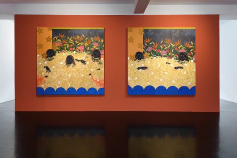 The scene in another diptych “The Invisible Guides” adopts a similar arrangement of background and figure. Three, respectively two, women look out of the canvas, their bodies bathed in flower foam as if smothered by a sea of feathers, lace, and white petals. Clothing hides and protects but is equally a statement of transforming identity and self-affirmation. Tshabalala experiments with the double vision of the diptych format, creating a stereoscopic adjacency that conveys a sense of in betweenness, of movement between situations and states of mind. If city life provides the context for lifestyle and fashion, then photographic archives feature prominently in Tshabalala’s artistic research. Gathered on social media or gleaned from glossy magazines such as early issues of South Africa’s House and Garden, these editorials provide a critical source for the artist with their strange anachronistic images of flower arrangements, interior settings, textures and colour once intended to embellish the modern twentieth century South African home. Leaning on this visual language, and reflecting Dutch flower paintings of the 17th century, she offers us psychotropic bouquets of hydrangeas, chrysanthemums, lilies, parrot flowers, red poppies and yellow corn. Frida Kahlo’s self-portraits come to mind with their floral wallpaper and tropical birds as do the jungle settings of Henri Rousseau “Le Douanier”, the sirens and mermaids in West African Mami Wata paintings, and the decorative portrait photography of Seydou Keïta that blends the sitter’s clothes with the studio backdrop.