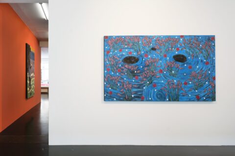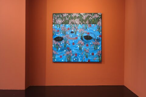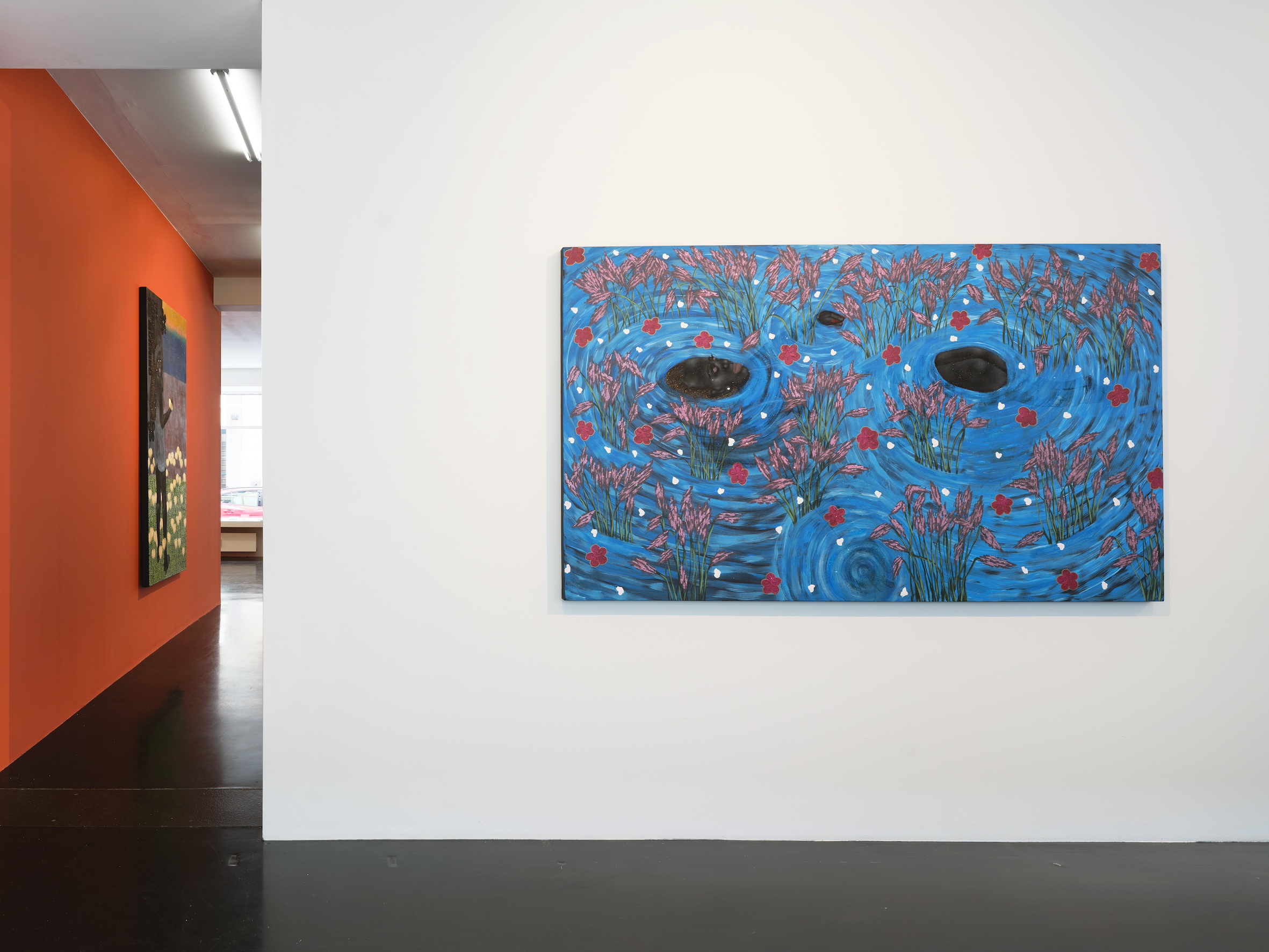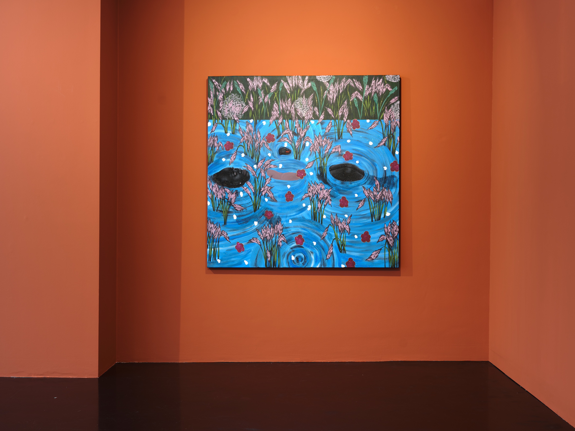 Tshabalala’s artistic world is both erudite and vernacular, stimulated by art-historical references as well as the ubiquitous visual culture of social media. In “Look to the Sky I/II” (2025), a Black female figure floats in a spiralling sea of blue, awash with petals and flourishing pink blooms. This crafted yet haunting imagery veils a complex expressive composition held together by the exquisitely patterned surface of the painting. It recalls Ophelia by English artist and illustrator John Everett Millais from 1851 painted in his iconic Pre-Raphaelite style. In Shakespeare’s Hamlet, Ophelia who is driven to madness by the murder of her father, enters the water of a lake, and dragged down by the weight of her gown, sinks into oblivion. In Tshabalala’s maelstrom, a woman’s face and limbs float precariouslyover azure waters in a psychic moment that oscillates between life and death. Her diptych captures the dizzying and suffocating effects of invisibility and uncertainty associated with moments of interiorisation and depression.