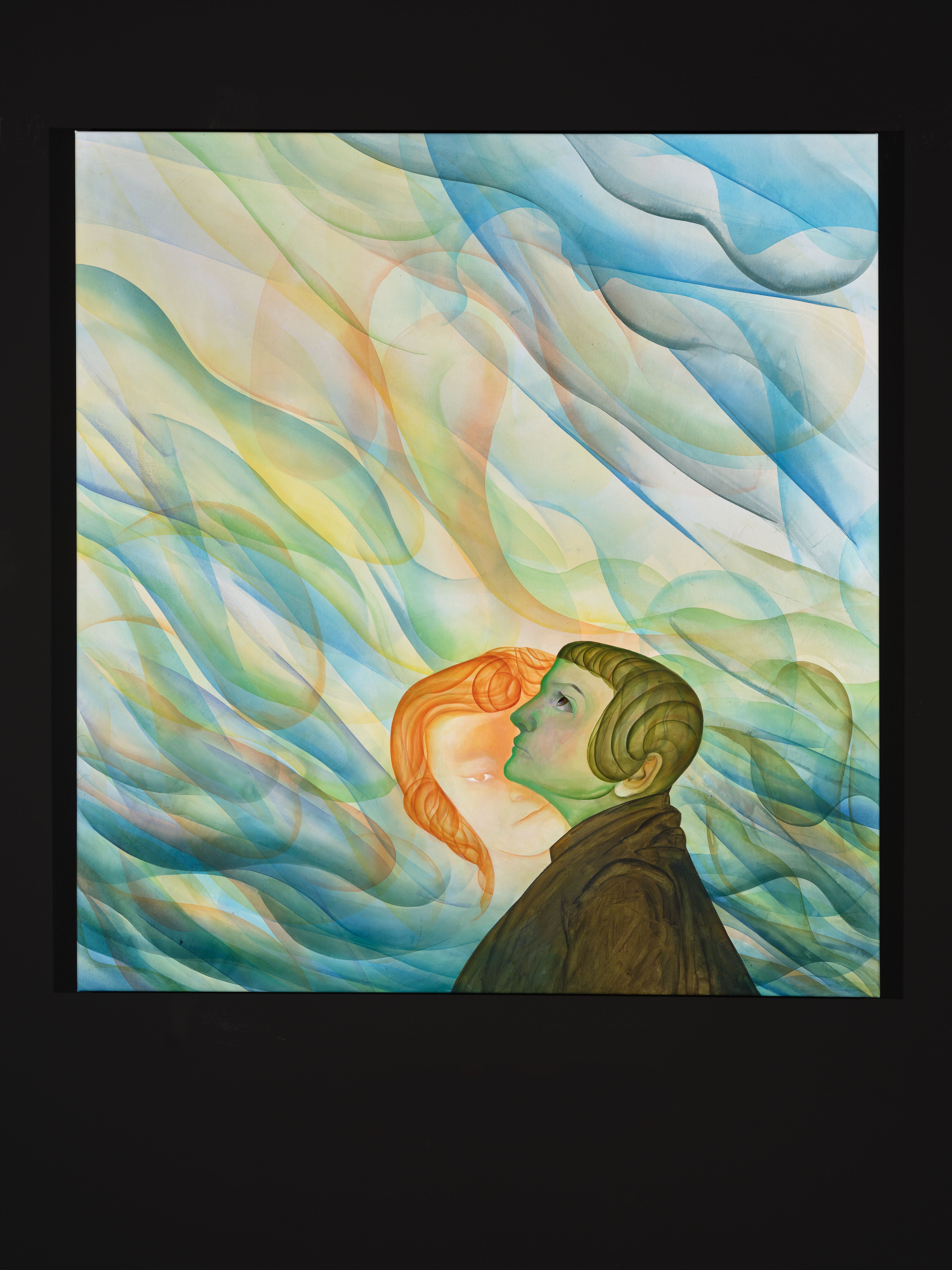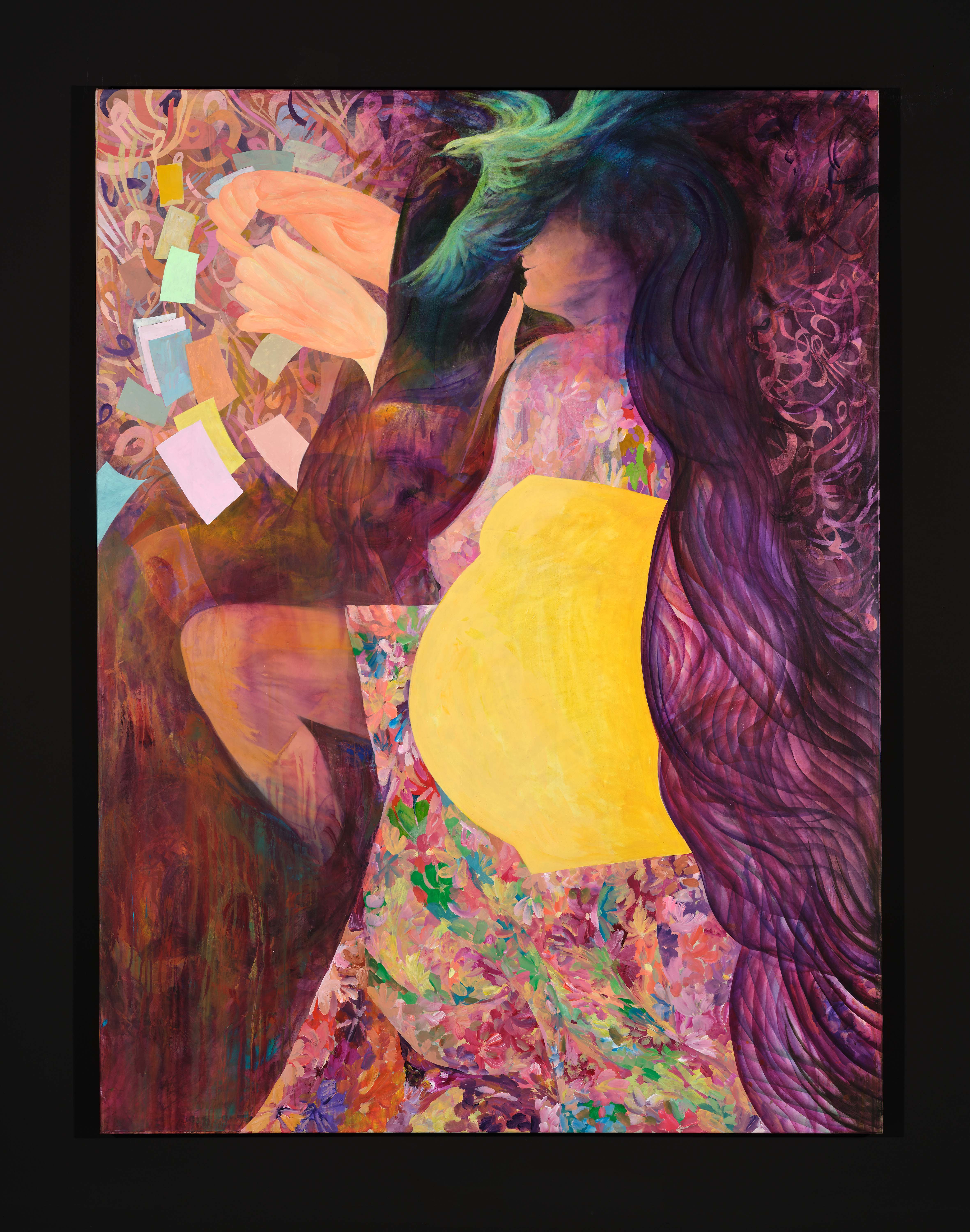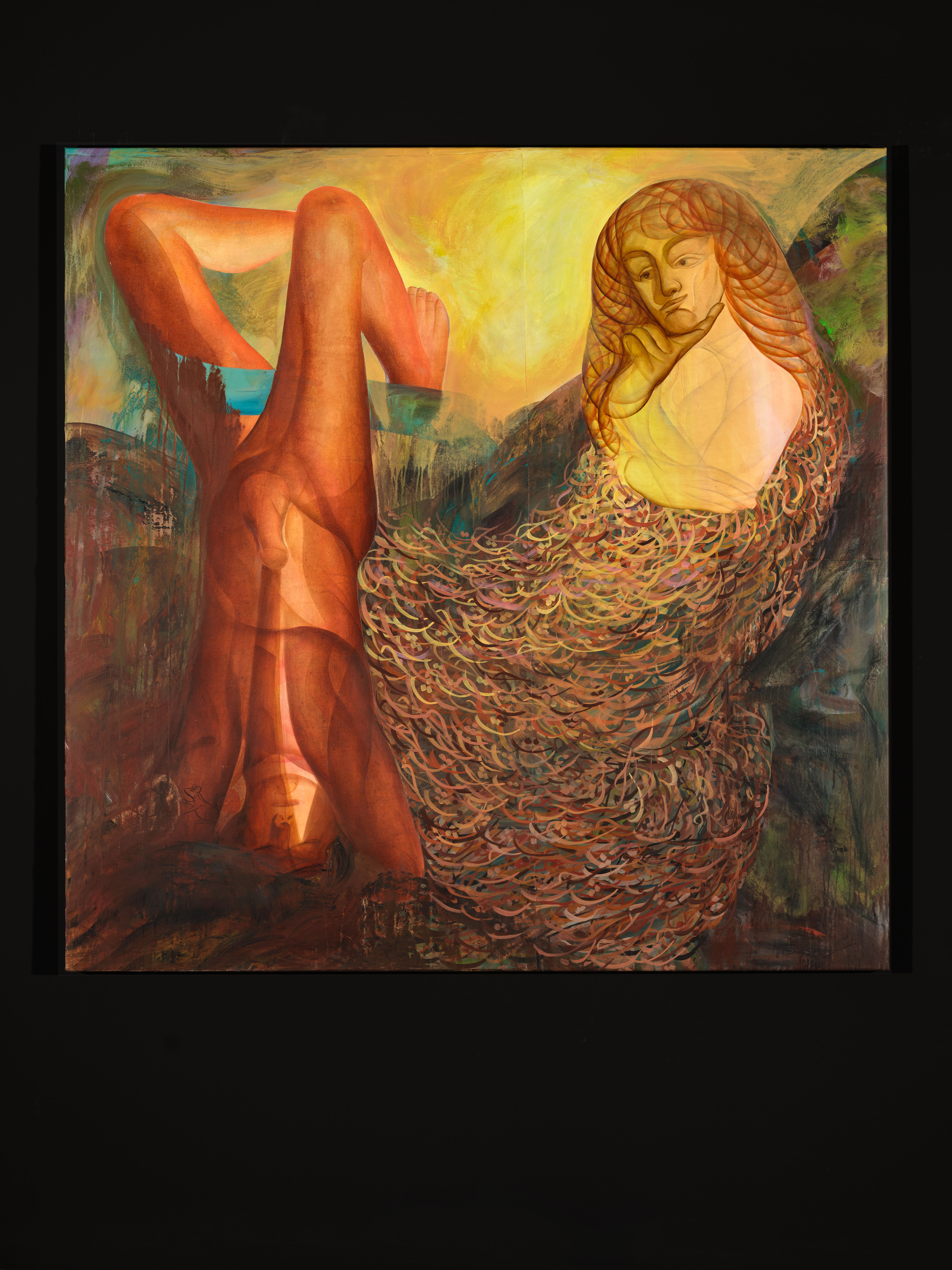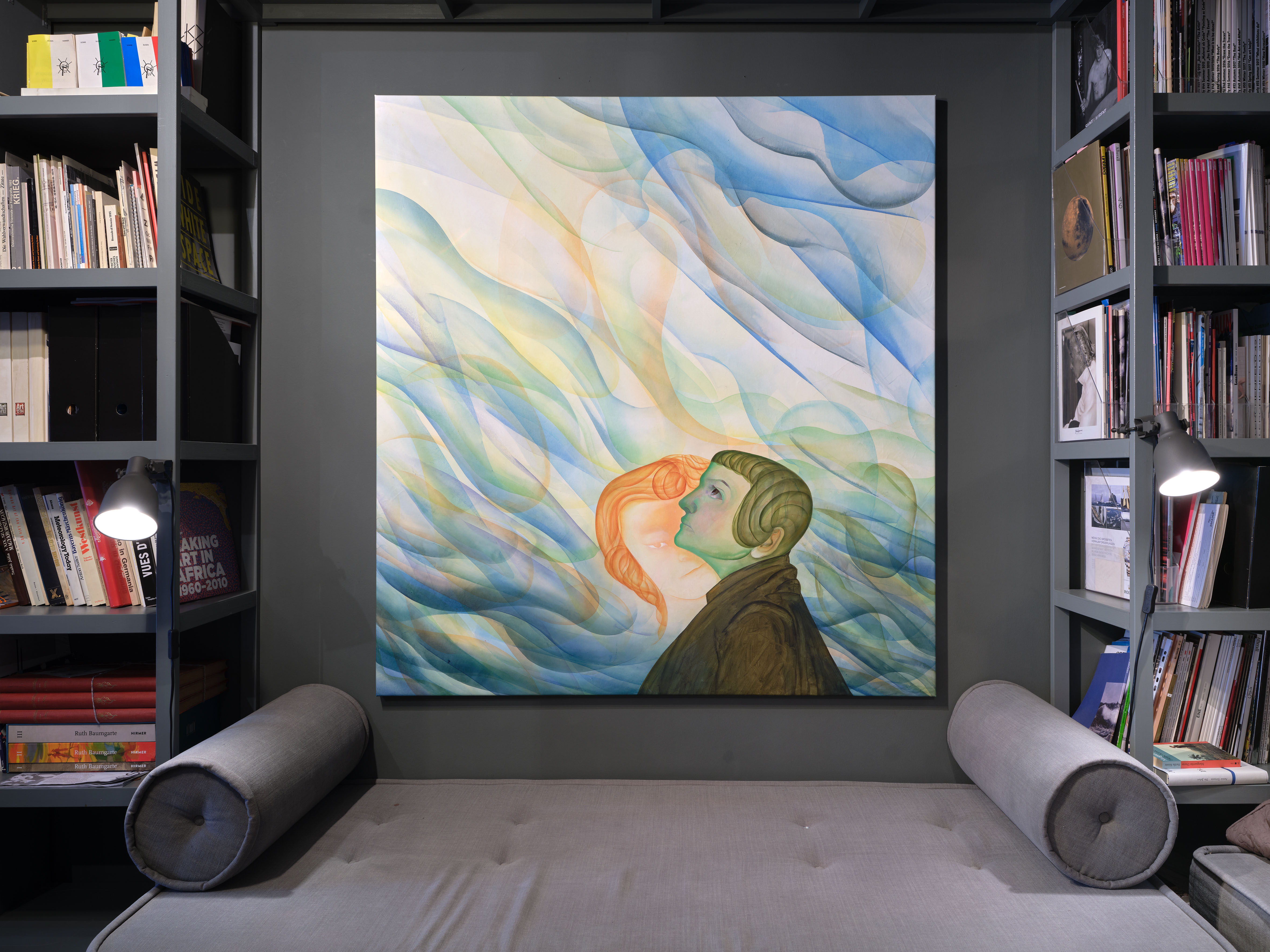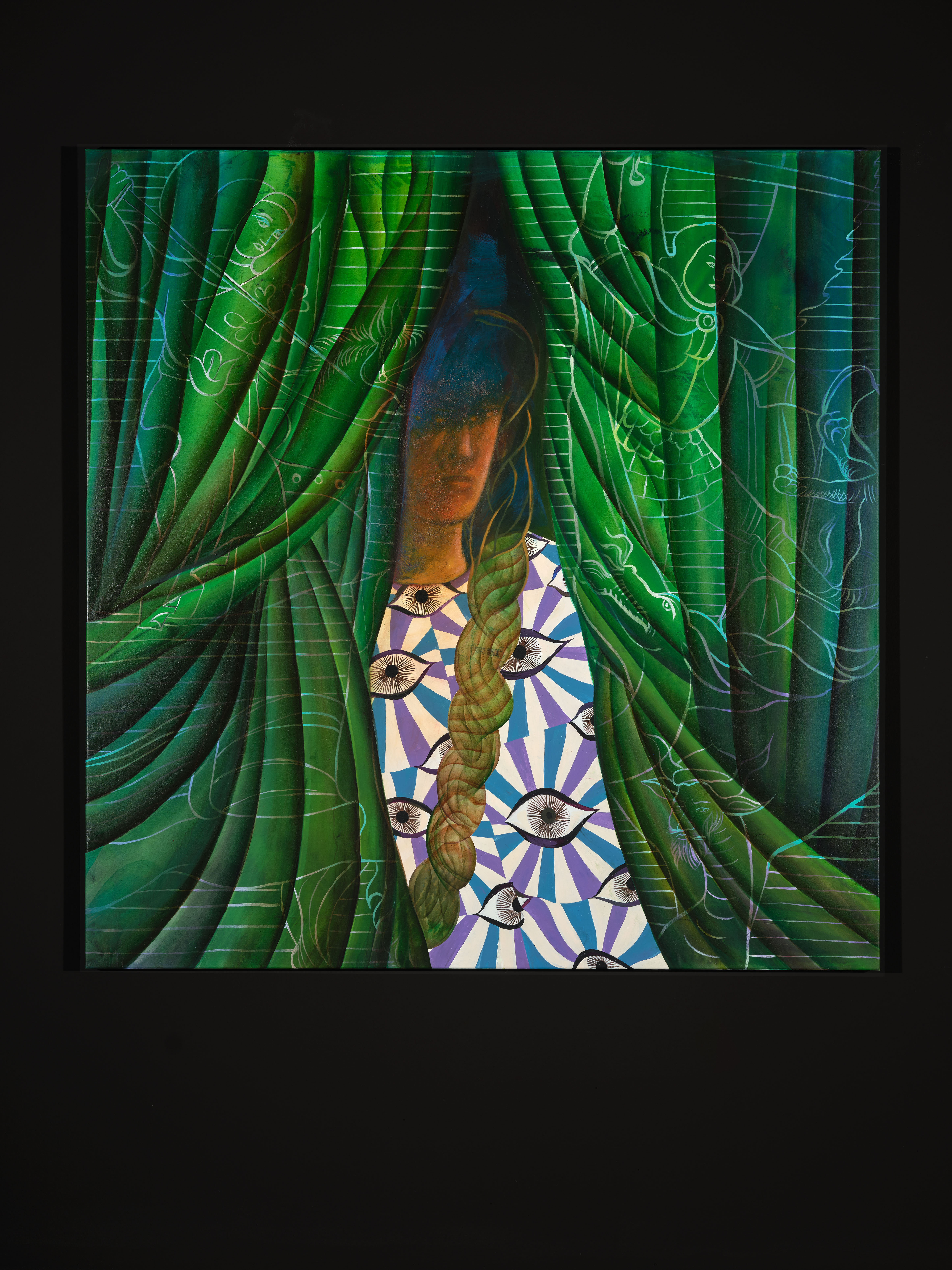 The human experience, life itself, and the relationships to oneself and to others form important subjects. Not coincidentally, portraiture is central to his work: a genre Alimirzaee masters with his confident, oftentimes androgynous figures that frequently hints at self-portraits. His characters are often depicted with long, flowing hair, which serves as both a symbol of cultural and social significance and a reflection of themes related to self-identity. Alimirzaee also shows how hair can be both a form of representation and a political statement. Feminine figures with shorter hair remind us of cutting one’s hair as a form of protest against injustice. It also reminds us of one of the most powerful recent symbols of this, when Iranian women cut their hair in solidarity after the death of Mahsa Amini in 2022, following her arrest for allegedly not wearing the hijab correctly.