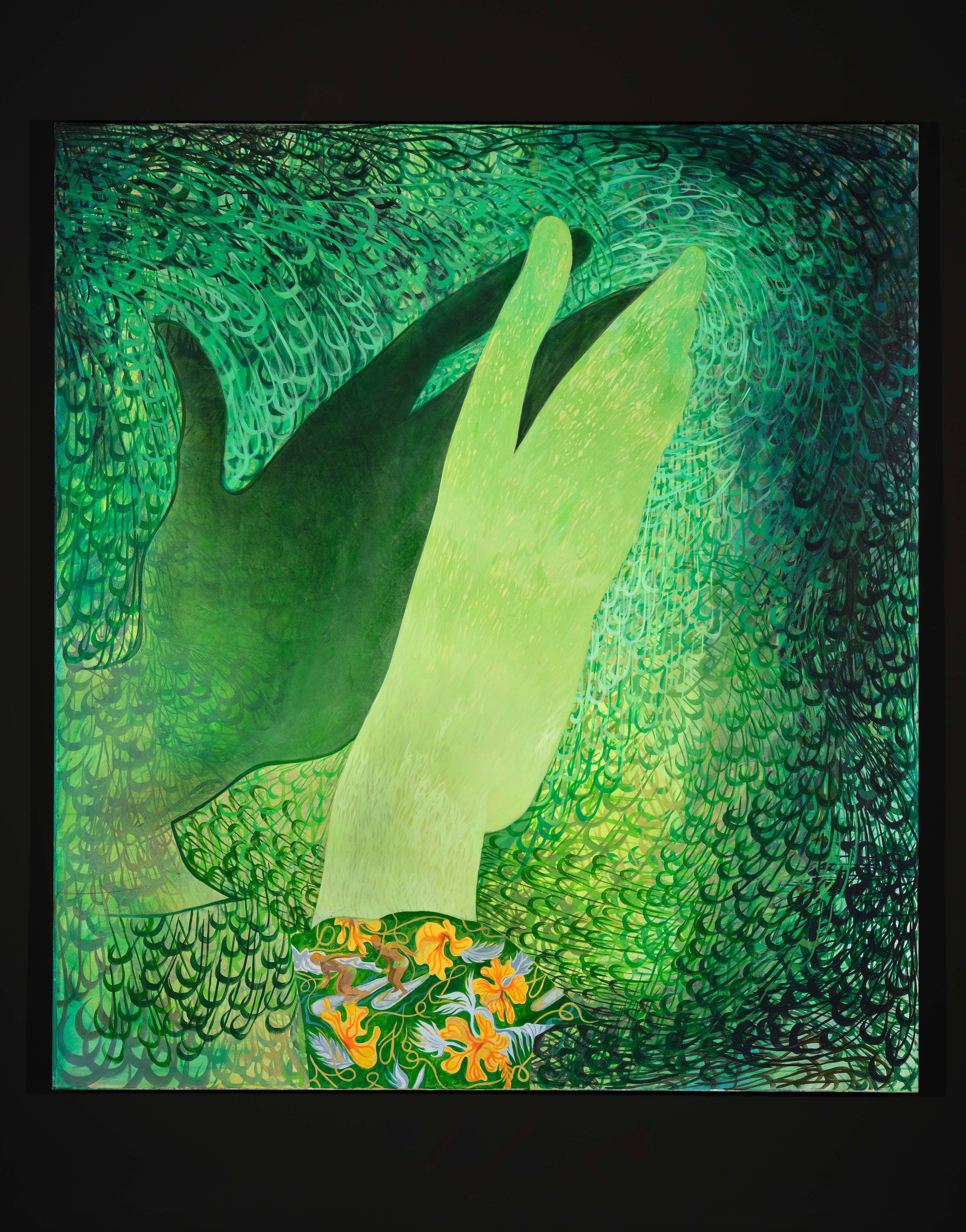 In Flattered by the Green, for example, Alimirzaee suggests a hand gesture common in Persian culture when celebrating or expressing joy. At the same time, the gesture can also be interpreted as a subtle reference to Albrecht Dürer’s iconic Praying Hands (1508).