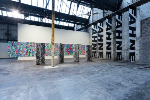 The five-part installation consisting of five-meter-long flags is part of a series of works in which Zobernig responds tautologically to invitations for art-in-architecture projects. One example of this is the Messeplatz in Basel. There, the words MESSE BASEL are embedded in the asphalt in large Helvetica letters, which can only be seen from a bird's eye view (for example, on Google Earth). Flags usually have strong identificatory meanings; they represent countries or groups. Arranged in rows, they appear monumental. Writing FAHNE (flag) on a flag short-circuits these meanings and directs the gaze away from the meaning and toward the pure object.