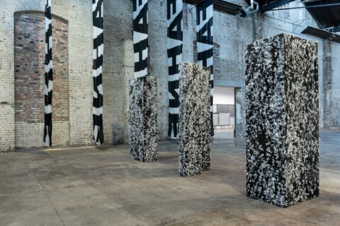 The work consists of four upright cubic forms with Tetris-like floor plans that, when interlocked, create a closed cuboid. These architecturally evocative sculptures were constructed from cardboard, their surfaces coated with black synthetic resin varnish and entirely covered with white goose down. They recall Zobernig’s early cardboard objects, while his use of feathers also resonates with references to minimalist sculpture from the 1980s.