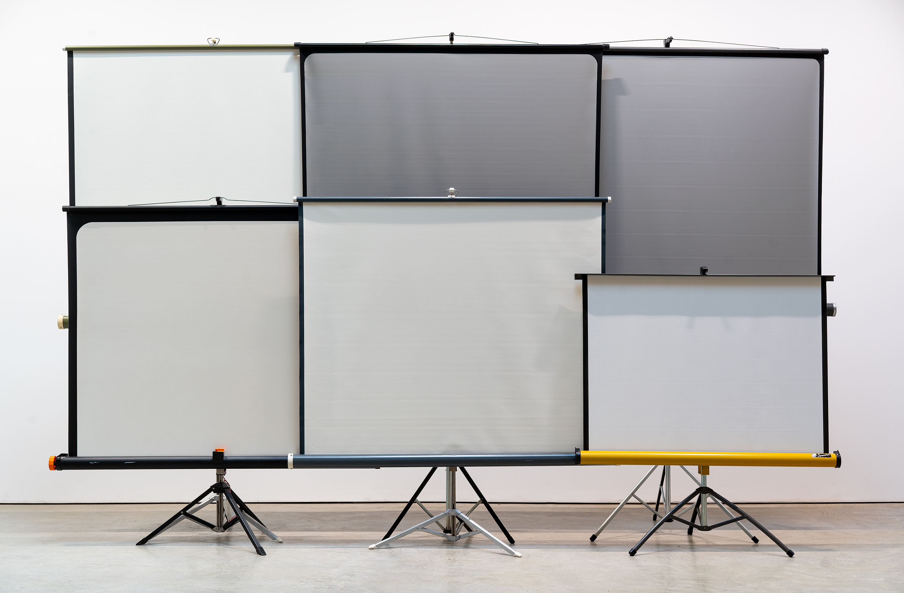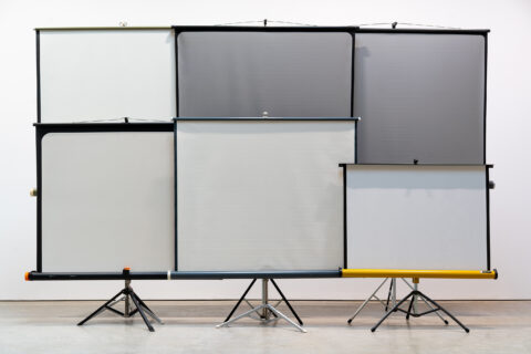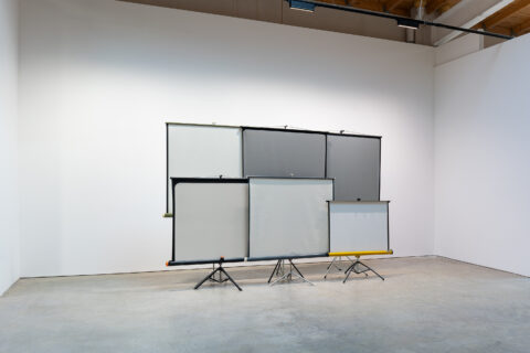 Zobernig regularly stages the means of presentation, as in the installation UTV Fernsehstudio (UTV Television Studio) or the Super 8 projection screen installations, a version of which we are presenting at the Wilhelmhallen. These projection screens were often used to watch home Super 8 films in private households and were later discarded when video technology replaced Super 8. Zobernig found the screens at Caritas, where items from apartment clearances are collected, which in Zobernig's eyes represent a kind of cultural memory. Projection screens usually function as neutral carriers for images. Zobernig frees them from this instrumental role and emphasizes their presence as material, sculptural, and spatial entities. Detached from their utilitarian purpose, they no longer fade into the background but are perceived as independent objects. Unlimited videos form a separate group of works in Zobernig's oeuvre. In his Video No. 23, Zobernig captures on video his slapstick attempts to set up Super 8 screens.