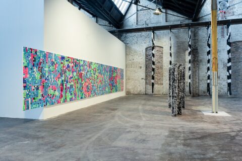 In the pixel paintings created since 2014, the pixel elements are now highly resolved and translated onto the canvas in irregular squares, some of them neon-colored. Some of these are abstract images that seem to capture the moments when pixels on a screen collapse in order to reform. In addition, there are text images with simple words such as LOOK, NEW VIDEO, or OH NO. The greater the distance from the viewer, the more clearly the words in the images can be read. In his major retrospective at Vienna's Mumok in 2021, Zobernig displayed all of his pixel paintings in one room, hung in rows, work to work. He now returns to this form of presentation at the Wilhelmhallen, showing an installation of six canvases whose order is simply determined by their date of creation.
