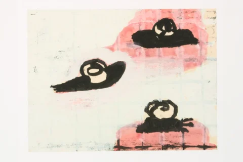 Across an unusually broad range of versions, materials, and techniques, she captured plants and living creatures on paper. Between 1989 and 1990, she created works that lend themselves beautifully to storytelling—depicting dragonflies, caterpillars, salamanders, flies, and frogs. At other times, roses, mushrooms, fir trees, landscapes, moles, snails, and birds served as points of departure for her drawings, as did exotic animals such as monkeys and bears. Some forms are rendered in color with brushwork, others with a confident line; occasionally, a subtle sense of humor emerges.