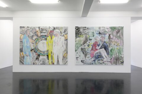 In this inhospitable and dystopian area, this "life after," he places mostly women, often with androgynous character. In contrast to the still-present catastrophe, the women sit or stand, unperturbedly aware of their appearance and clothing. These seem to be casual meetings, perhaps a lunch break among workers. All those depicted appear to be waiting in good spirits, smiling in anticipation of how all this will continue. Style and attitude still matter, or perhaps even more so now. Mayer's entourages and female formations are placeholders for a feminist society that resolutely faces the future despite the post-catastrophe.