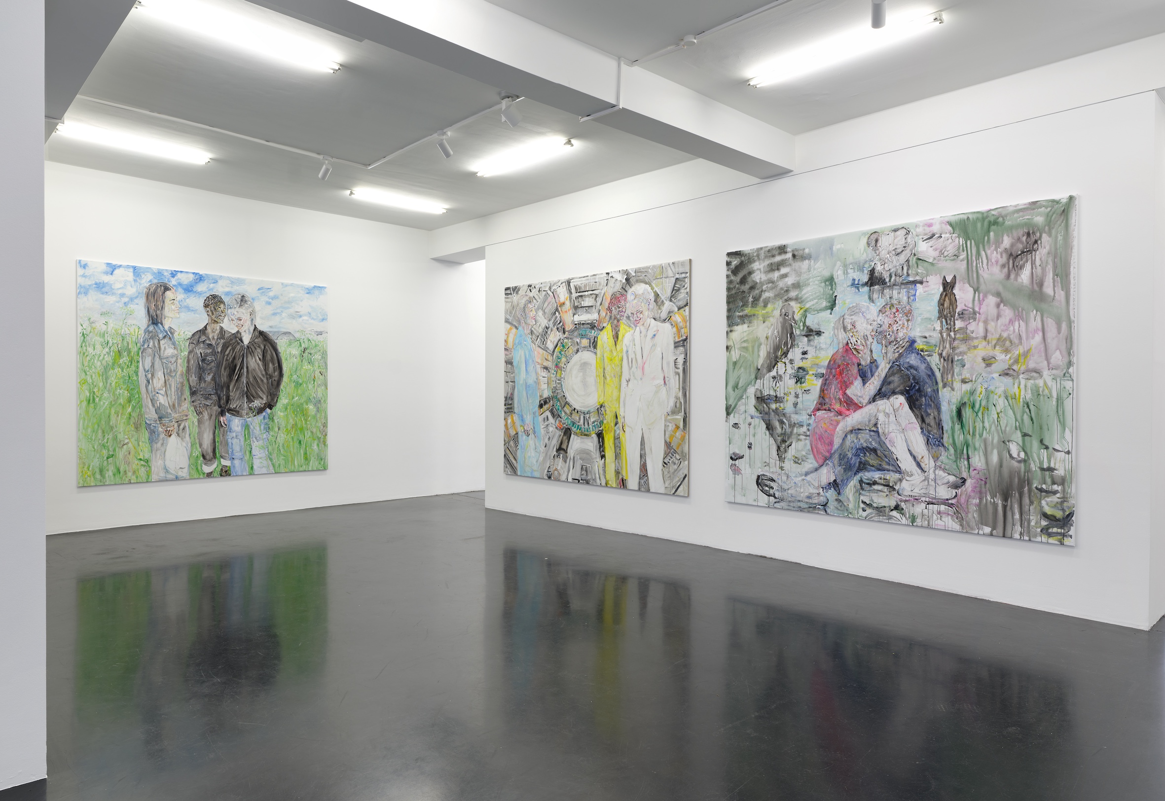 In this inhospitable and dystopian area, this "life after," he places mostly women, often with androgynous character. In contrast to the still-present catastrophe, the women sit or stand, unperturbedly aware of their appearance and clothing. These seem to be casual meetings, perhaps a lunch break among workers. All those depicted appear to be waiting in good spirits, smiling in anticipation of how all this will continue. Style and attitude still matter, or perhaps even more so now. Mayer's entourages and female formations are placeholders for a feminist society that resolutely faces the future despite the post-catastrophe.